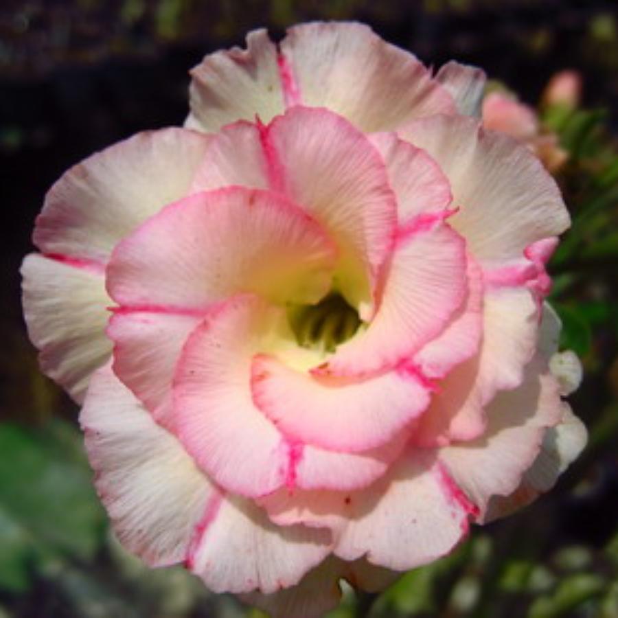 Adenium Chankajang - декоративное деревце уникальной формы. Ствол серый. Цветки большие, пышные, трехцветные. Лепестки закругленные, волнистые. Окрас лепестков желтый у основания, белый с розовыми оттенками в центральной части с насыщенно-розовой каймой.