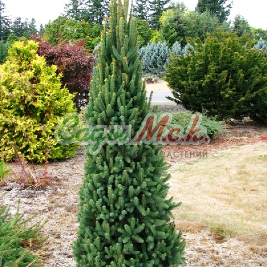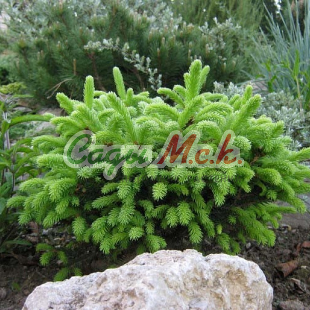 Ель шаровидной формы. Крона плотная компактная, к 10-ти годам диаметр кроны около 30 см. Годовой прирост 2-3 см. В штамбовой форме высота зависит от места прививки. Хвоя серебристо-голубая. Место солнечное. Почва умеренно влажная, дренированная. Зона 3 (до -34ºС). Отличный сорт для небольших приусадебных участков, альпинариев, для выращивания в контейнерах.