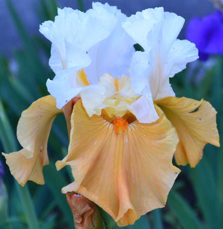 Ирис бородатый Аффайр - белые с фиолетовым отливом стандарты, фолы горчично-жёлтые с тонкой сиреневой каймой и горчичной бородкой. Группа Высоких бородатых ирисов, высота куста 75 см.