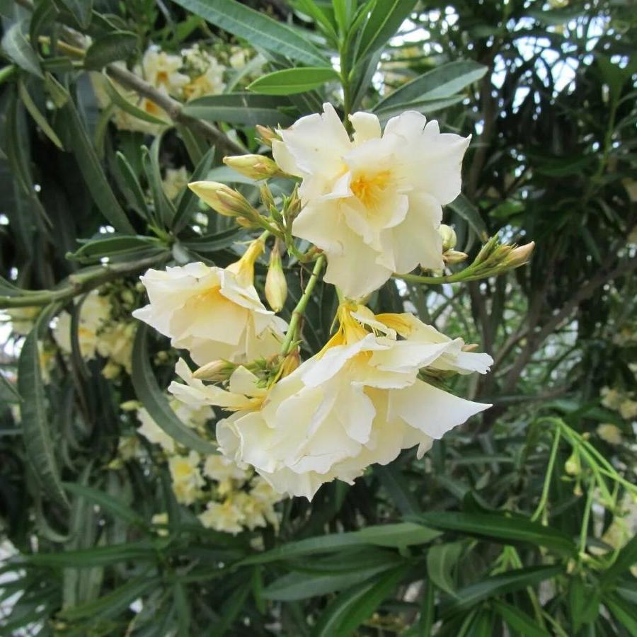 Олеандр обыкновенный Флавсенсес (лат. Nerium oleander Flavescens) - кустарник с мощными вертикальными стеблями, цветущий летом. Цветки ароматные, простые, бело-желтые. Листья длинные, темно-зеленые со светло-зеленой жилкой посередине каждого листочка. Внимание! Олеандр - ядовитое растение, поэтому при его культивировании требуется осторожность.